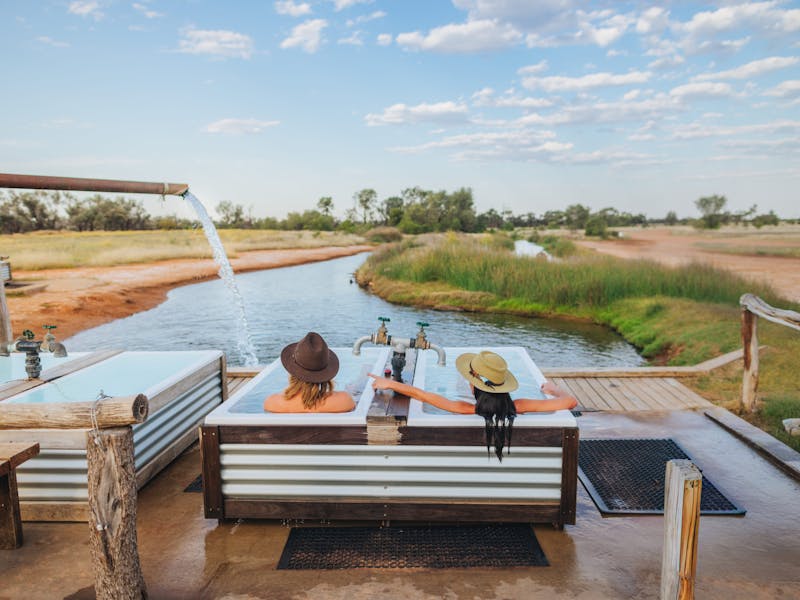 Unpowered campsites are within walking distance of 14 baths delivering free-flowing artesian water naturally heated up to 42°C that become ‘hot property’ at sunrise and sunset. Enjoy a bushwalk, roast marshmallows around the campfire, and relax under the stars. The pet-friendly Bore Campsite offers amenities and Wi-Fi, with a Merch Hut and licensed bar opening during peak season.