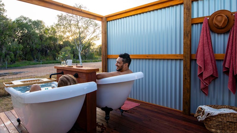 As well as powered and unpowered campsites, Talaroo offers stylish Eco Tents, two of which feature a private bathing experience with twin clawfoot baths fed by the healing waters of the ancient Hot Springs.
