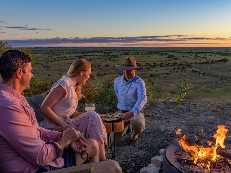 For those seeking “refined ruggedness”, Rangelands Outback Camp offers an exclusive luxury glamping experience for just 12 supremely pampered guests at a time. An onsite private chef prepares breakfasts and gourmet multi-course dinners that celebrate local produce and outback culture, paired with fine wines and premium beers. Each afternoon, guests can gather on the Sunset Deck for drinks and gourmet canapés as the landscape glows gold.